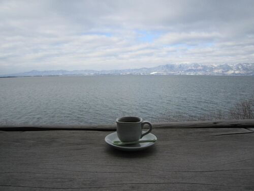 シャーレ水が浜のテラス席でコーヒーです 到着~久々に訪問です お邪魔します~ 薪ストーブがお出迎え テラス席へ この時期・・・(^_^;)貸し切りです コーヒーをお願いしました しばし~待ってコーヒーです 対岸の雪山を眺めながら至福の時間です 他のお客様…
